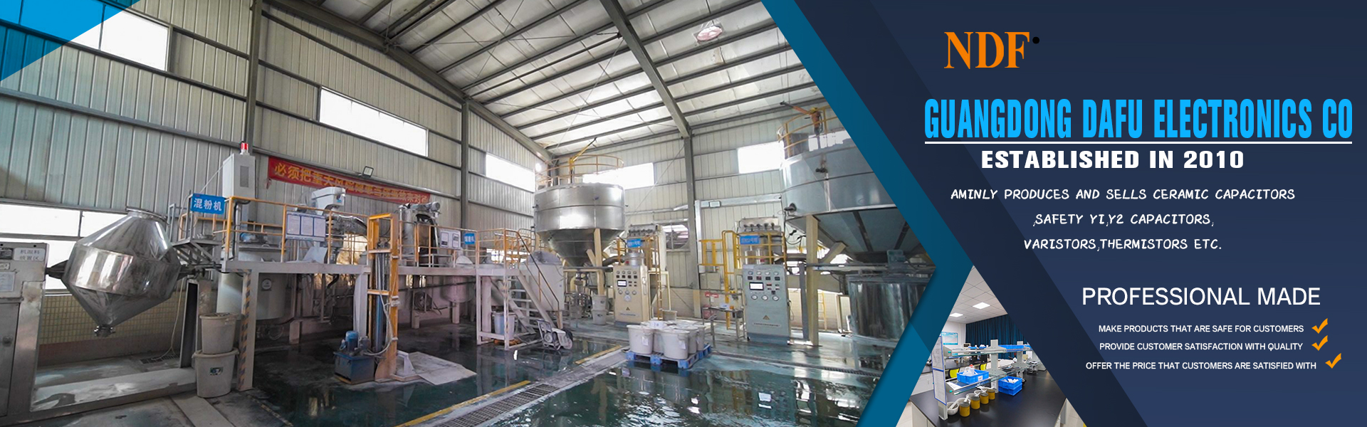 Dongguan Dafu Electronics Co., Ltd., established in 2010, mainly produces and sells ceramic capacitors, safety Y1, Y2 capacitors, varistors, thermistors etc.